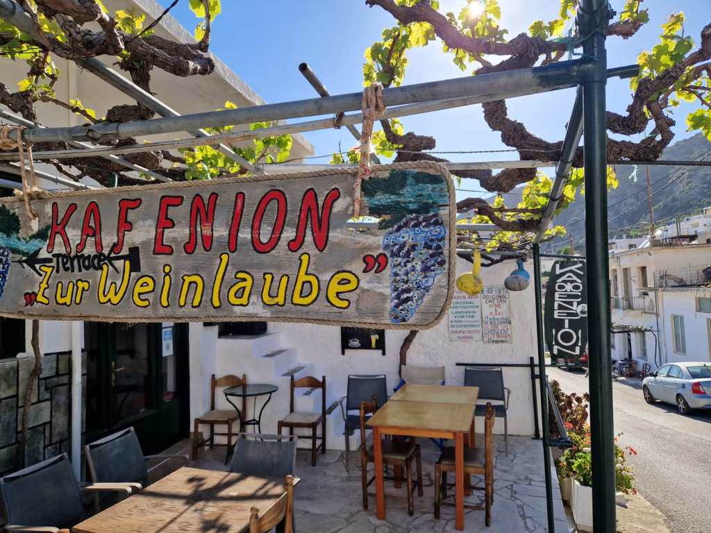 Nach der Anstrengung bietet sich die Einkehr in der Taverne Piperia oder in der Weinlaube an.